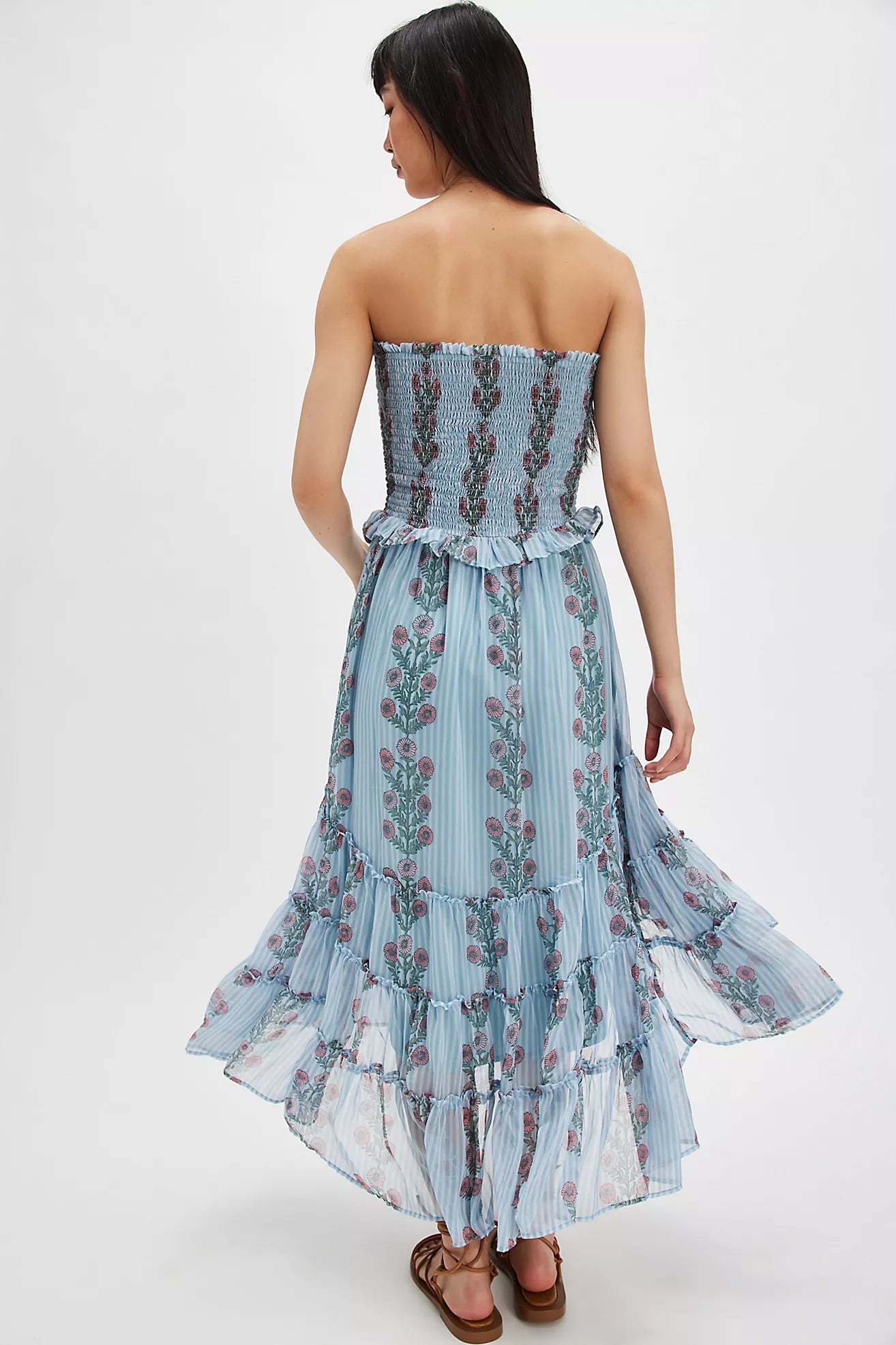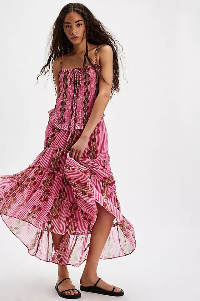 Features: Shirred bodice, dropped-waist seam, tiered skirt design, vintage-inspired floral block print throughout, removable straps