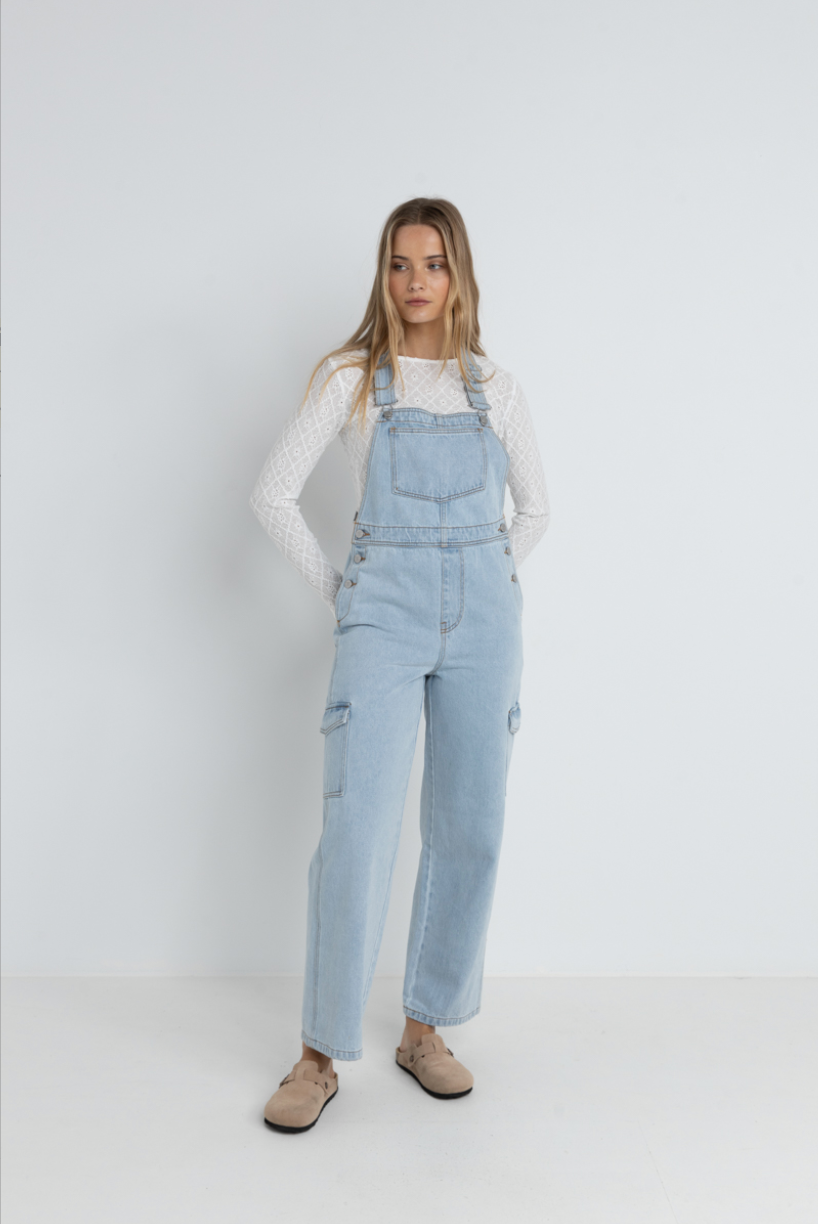 The Cargo Overalls combine rugged utility with modern style. Made from rigid, light-blue cotton denim, they come in a relaxed fit, and feature a large front patch pocket, side cargo pockets, and a diamond-shaped back panel. Offering a blend of function and fashion, they're perfect for beachside projects and urban explorations.