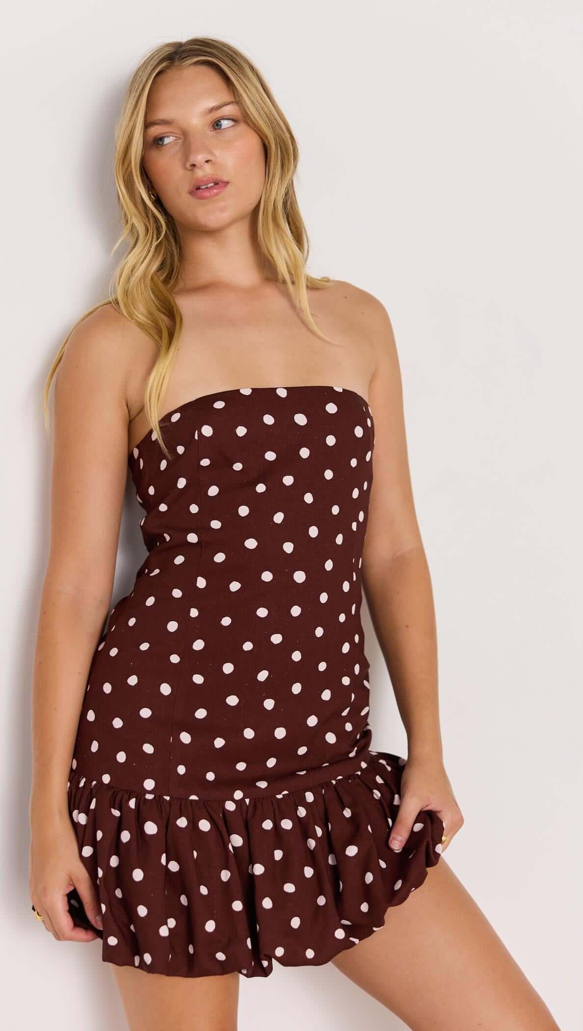 Flirty and fun with a vintage twist. The Cedar Bubble Mini Dress features a strapless neckline with a detachable halter strap, fitted bodice, and a playful bubble hem. The chocolate polka dot print ads retro charm - perfect for party season or sunny days out.
