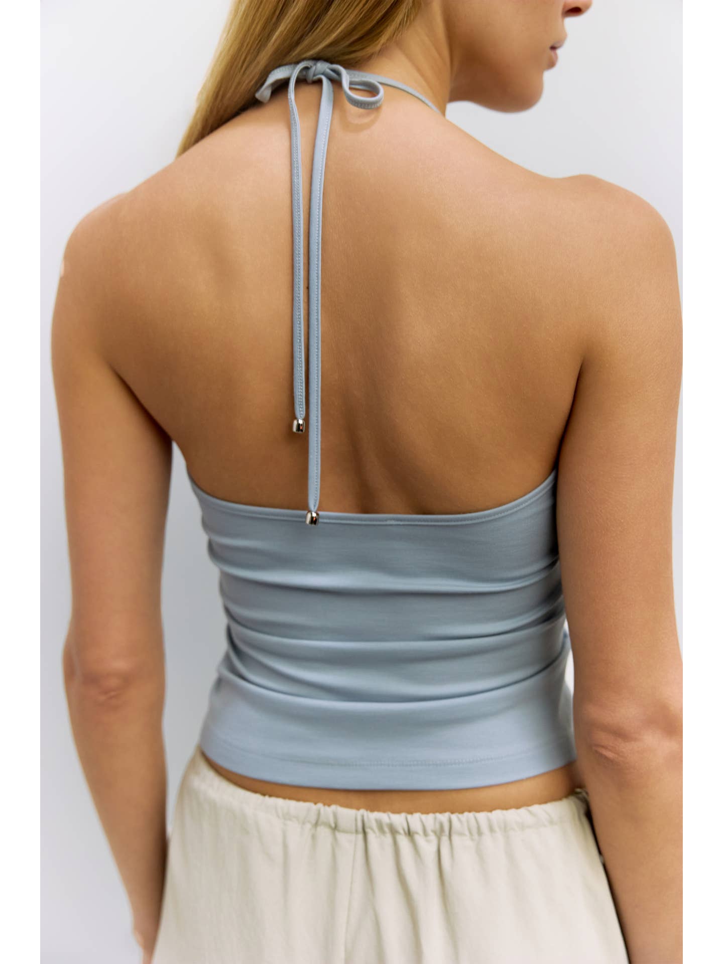 The Crystal Top is a form-fitting, sleeveless style crafted from a midweight viscose-blend knit. Designed with an adjustable halter tie finished with silver trim.