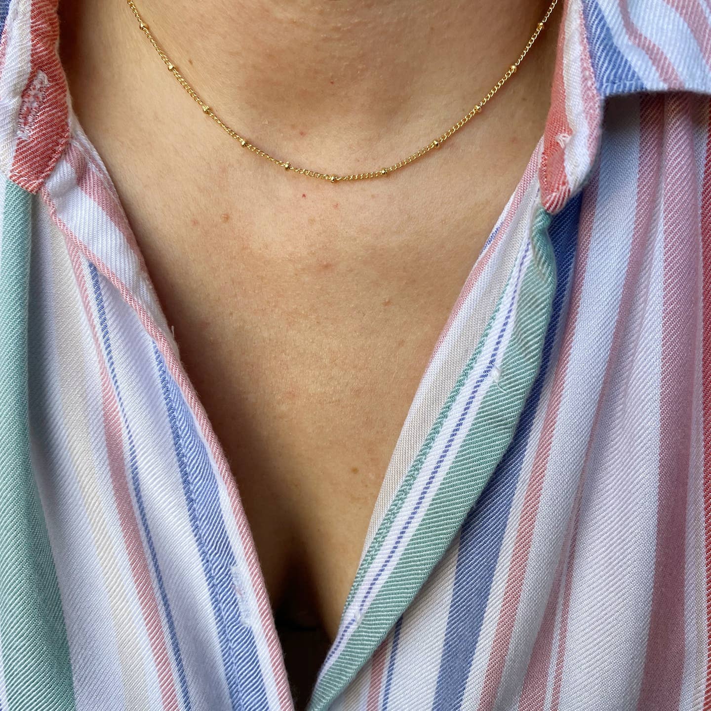 So delicate and gorgeous 1mm Satellite Chain in 18k gold filled. Featuring little A great wildcard product where you can match with any pendant or charm. * Hypoallergenic jewelry. * You may wear them while bathing, on the beach, or in the pool. * Fine 18k gold filled made in Brazil.
