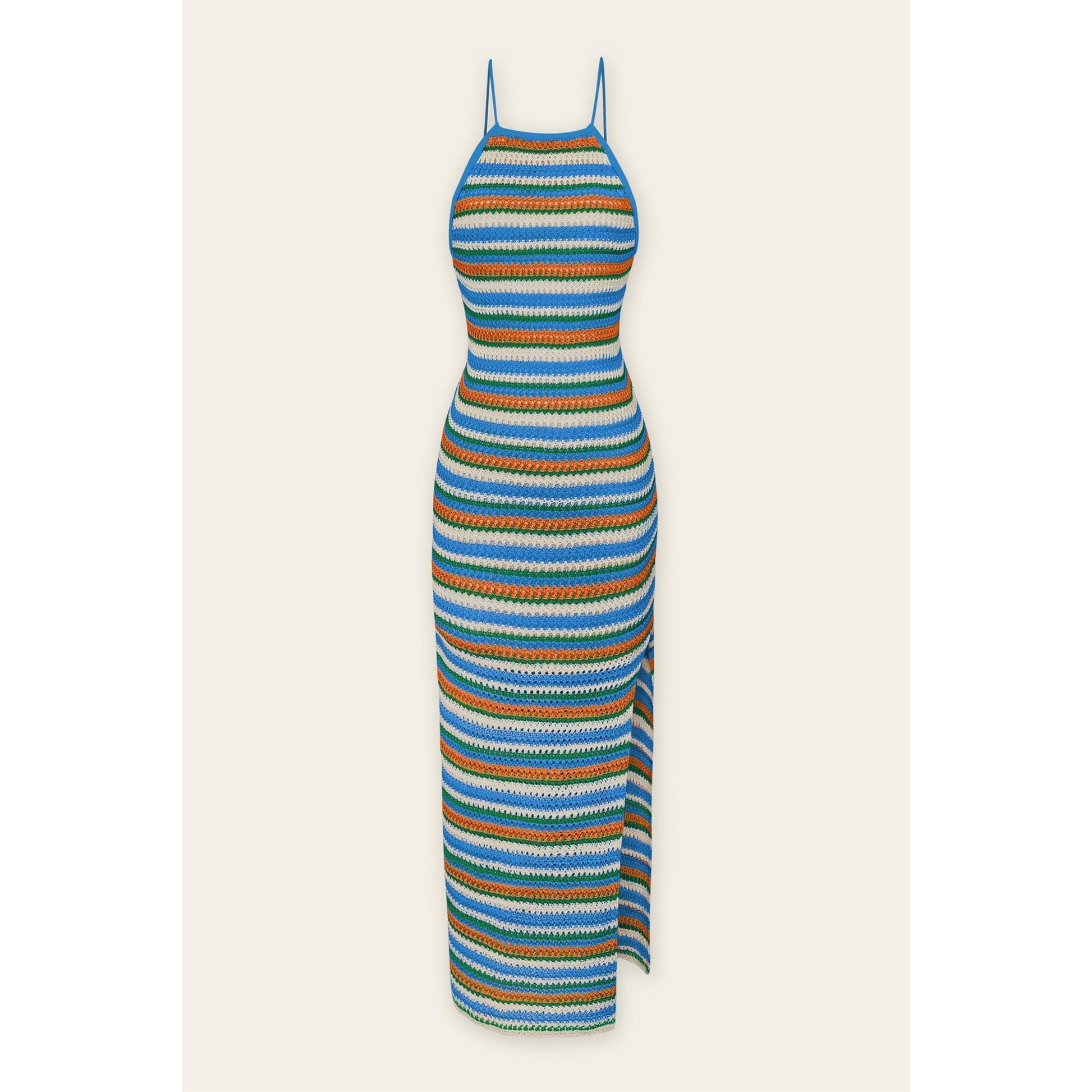 Striped knit dress featuring fitted silhouette and open back. - Fitted silhouette - Pull on design - Adjustable criss-crossed back tie - Open back - Side slit - Lined Shell: 100% Polyester Lining: 100% Polyester