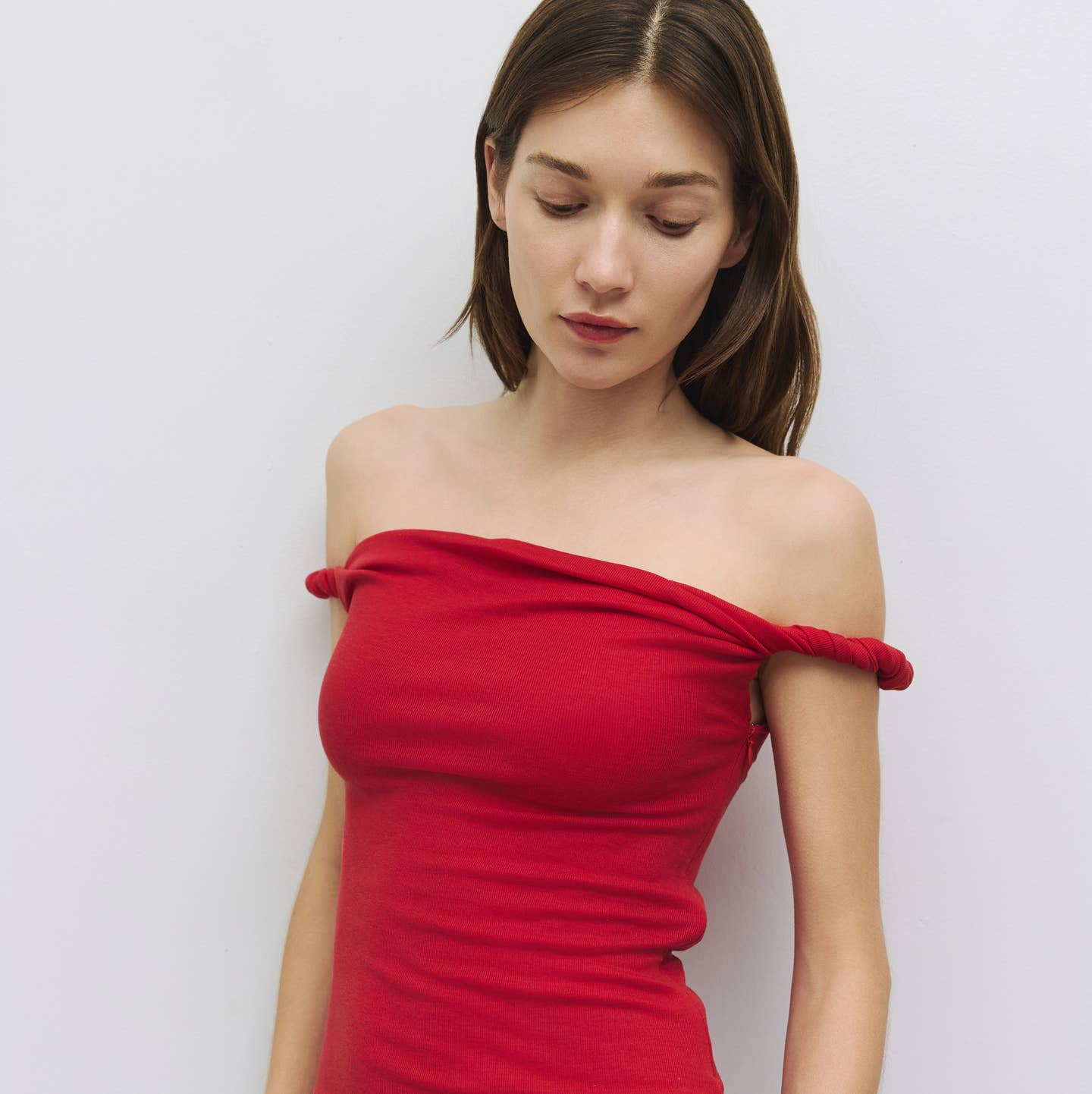 The Alix Top is a twisted off-the-shoulder tank top designed with a lightweight wool-blend knit fabric. The double-layered bodice ensures a seamless silhouette while the twisted shoulder detail and form-fitting design exude a flirty and flattering look.