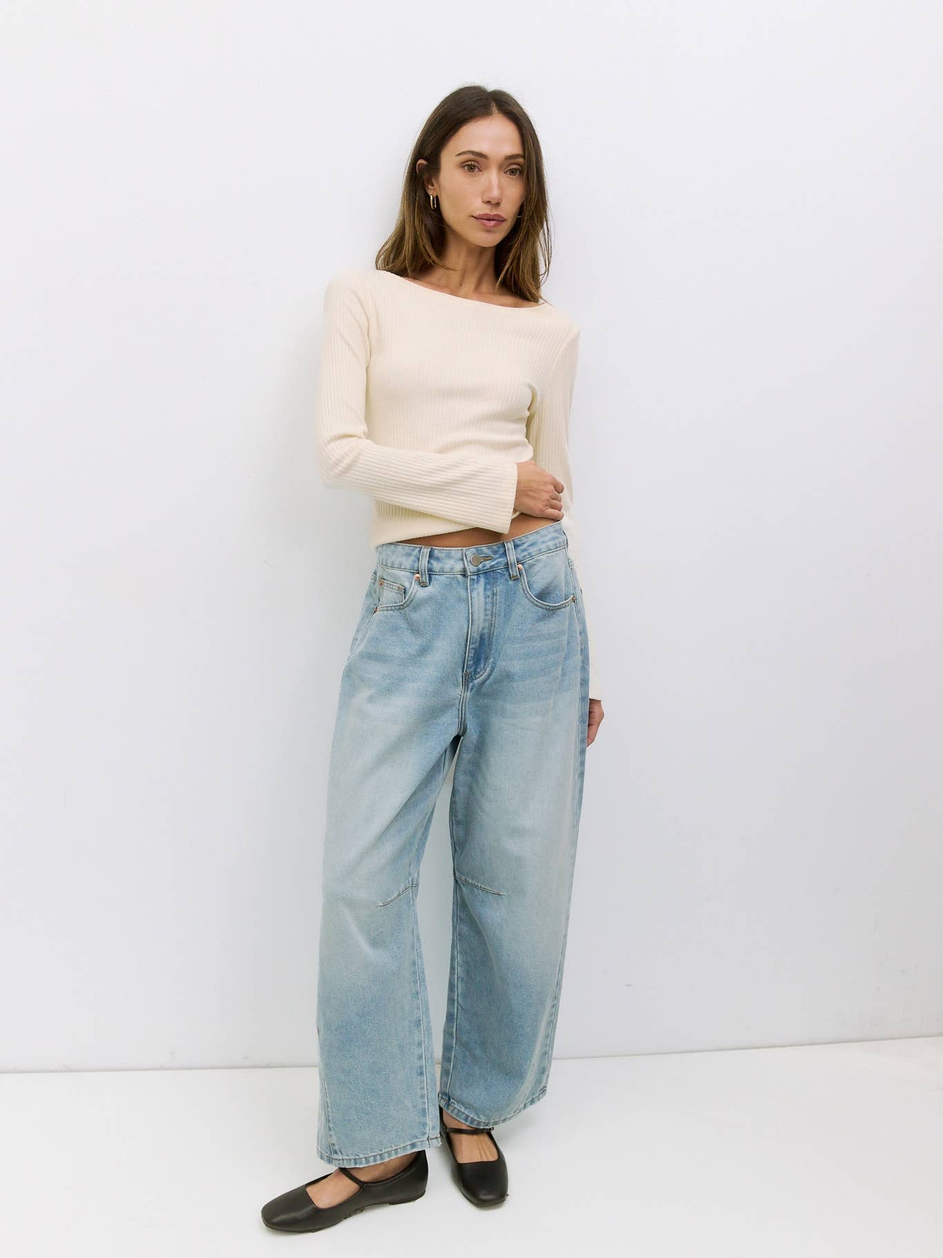 The Evie Top is a sleek, form-fitting long-sleeve top with midweight ribbed knit. Its wide neckline and flared long sleeves bring effortless structure and visual interest.